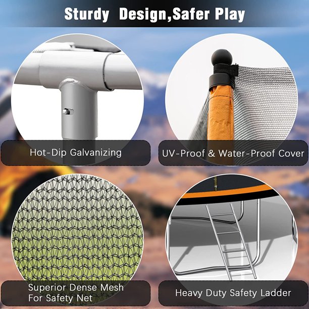 - 【SAFETY & QUALITY VERIFIED 】15ft trampoline has been tested to 20,000 jumps. The reinforced jumping mat PP has passed American UV standard 5000hours test. Padding cover PE and safety net PE has passed American UV standard 500 hours test. Our trampolines are equipped with PE sleeves outside the black EPE foam on safety net tubes.The Sleeve protects the EPE foam from sun, wind, snow and thus makes it last longer.