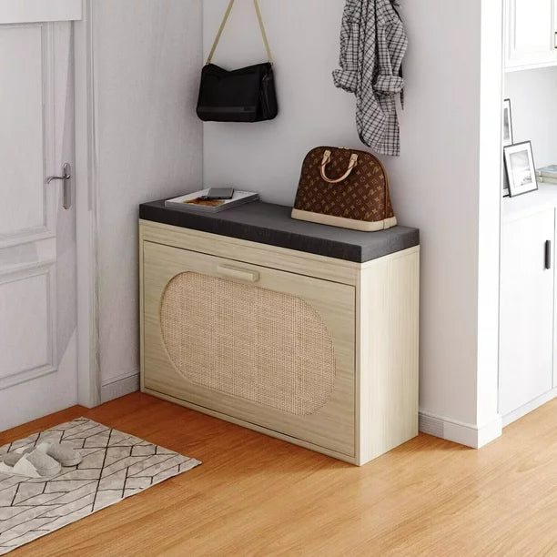 2 Tier Shoe Bench, Rattan Shoe Rack with Padded Seat, Shoe Cabinet with Flip-Drawer, Shoe Storage Bench Organizer for Entryway Hallway Living Room