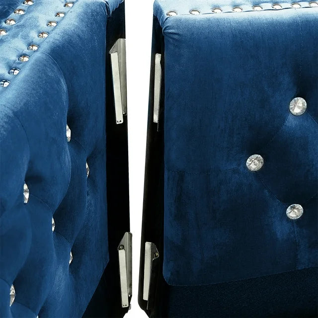 Sofa is covered in soft velvet jeweled buttoned tufted on the outside and inside of the arms and backs. Pocketed coil cushion seats make this set comfortable and durable. silver nailhead trimmed and finished off with chrome-plated legs, it also includes throw pillows.