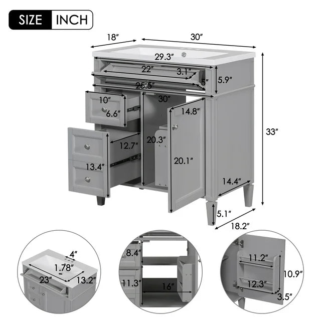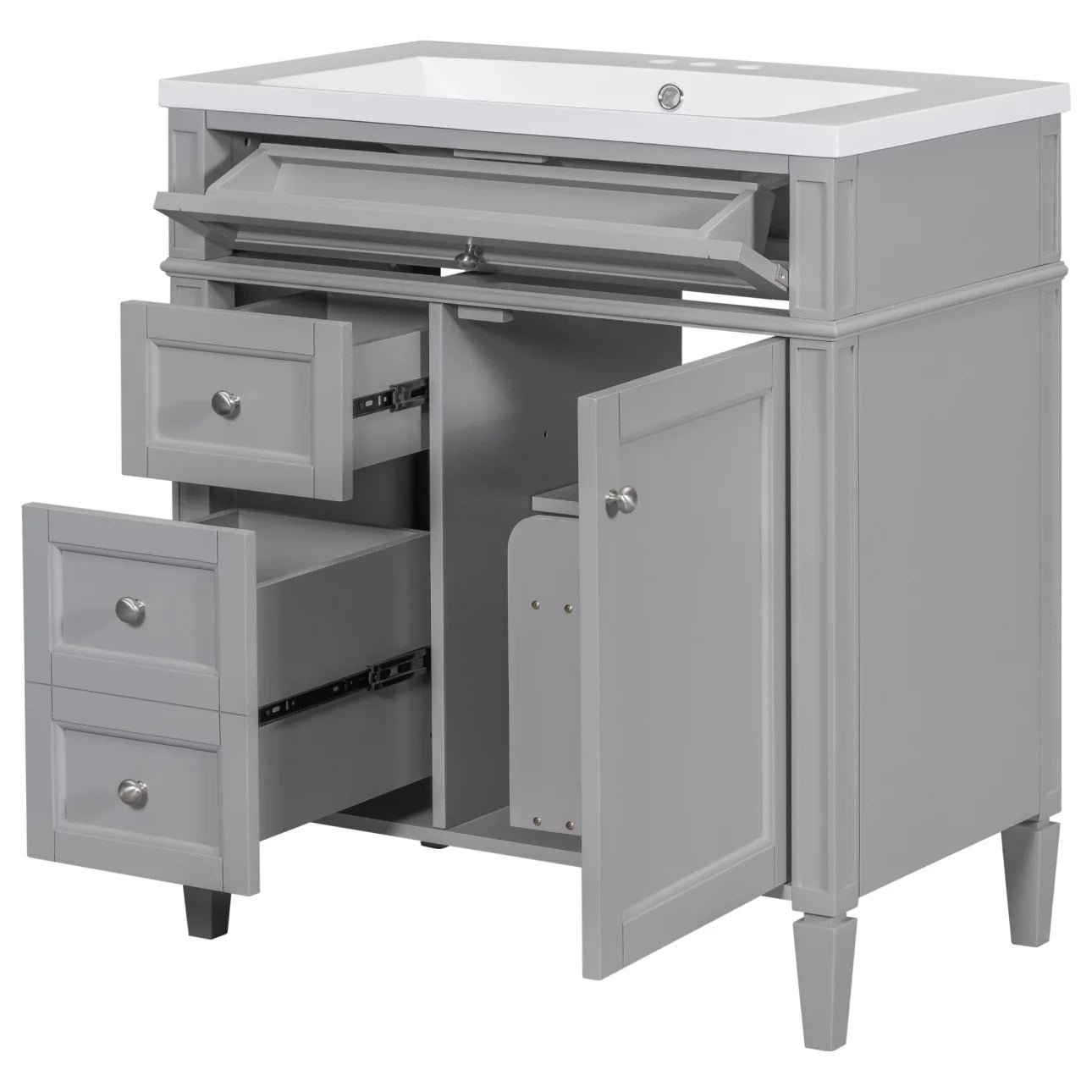 30" Bathroom Vanity with Sink, Bathroom Vanities Combo Cabinet with 3 Drawers and Storage Cabinet, Stand Storage Bathroom Vanity Cabinet for Bathroom & Small Space, Grey