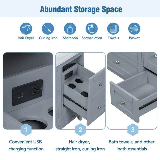 36 Inch Bathroom Vanity with Sink and USB Charging, Freestanding Floor Storage Vanity Cabinet with 2 Doors and 3 Drawers, Small Single Combo Cabinet-Faucets Not, White & Gray Blue