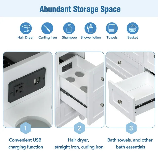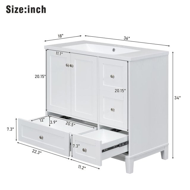 36 Inch Bathroom Vanity with Sink and USB Charging, Modern Bathroom Sink Cabinet with Two Doors and Three Drawer, Bathroom Storage Vanity Cabinet with Single Top Sink, Faucets Not Include, White