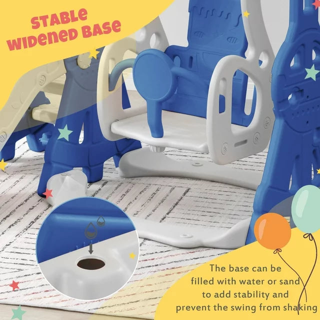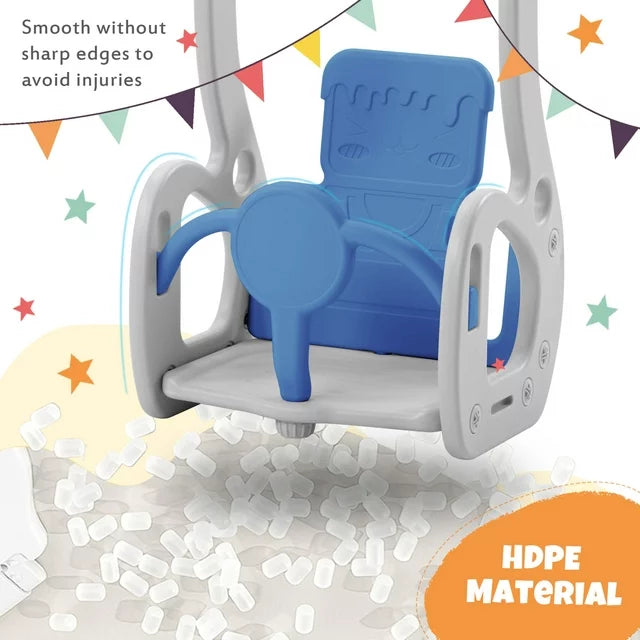 The 4-in-1 multi-functional play set features kids slide, indoor baby swing, kids indoor basketball hoop, and toddler climbing ladder. The indoor slide has a gentle slope and a buffer zone that allows children to slide safely. The kids indoor slide has easy-to-climb steps.The kids indoor swing with a wide seat has T-shaped protection for safety.The activity center could help exercise kids jumping ability and motor skills.The playset with slide is made of durable and HDPE material.This bright and colorful toddler swing and slide set can be assembled quickly.Gift your kids with this never-ending adventure for this holiday season!