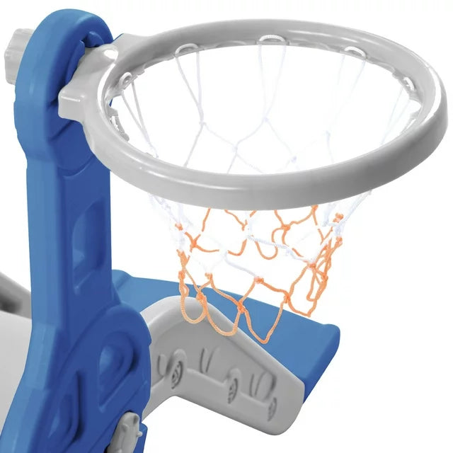 - 4-in-1 Play Center - This playset is designed to encourage kids to get up and active. He can climb up the steady stairs, slide down the long slide, swing, and play basketball. Let your kids and their friends be entertained for hours!