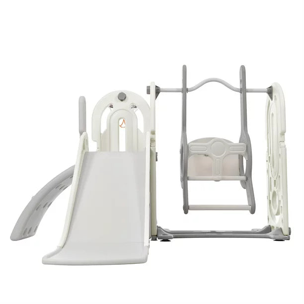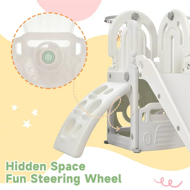 - [Children's Playground 5 in1] Refreshing styling design! Delicate and cute freestanding swing and slide set for toddlers with three functional parts: 1 slide, 1 climbing ramp, 1 swing, 1 basketball hoop, and 1 hidden space with a fun bus steering wheel. This set allows children to completely release their playful nature, and they can play with their friends for hours!