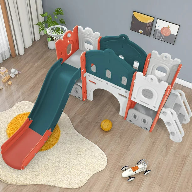 5 in 1 Toddler Slide Indoor Outdoor, Freestanding Castle Climber Playset with Slide and Basketball Hoop, Plastic Slides for Kids Toddlers Backyard Playground Activity with Toy Storage Organizer, Red