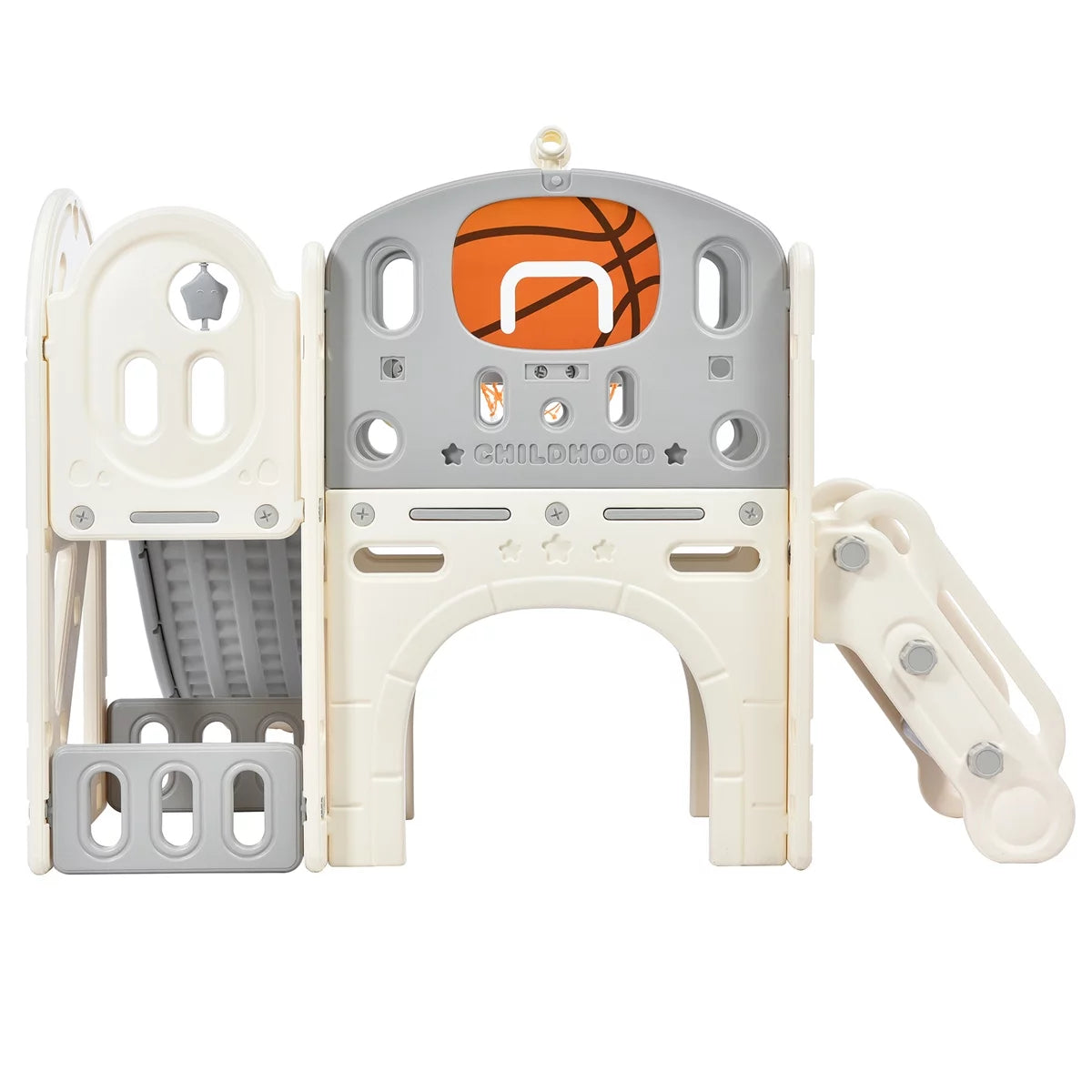 7 IN 1 Kids Slide Playset Structure, Freestanding Castle Climbing Crawling Playhouse with Slide and Arch Tunnel, Toy Storage Organizer with Ring Toss and Basketball Hoop for Toddlers Kids, Gray