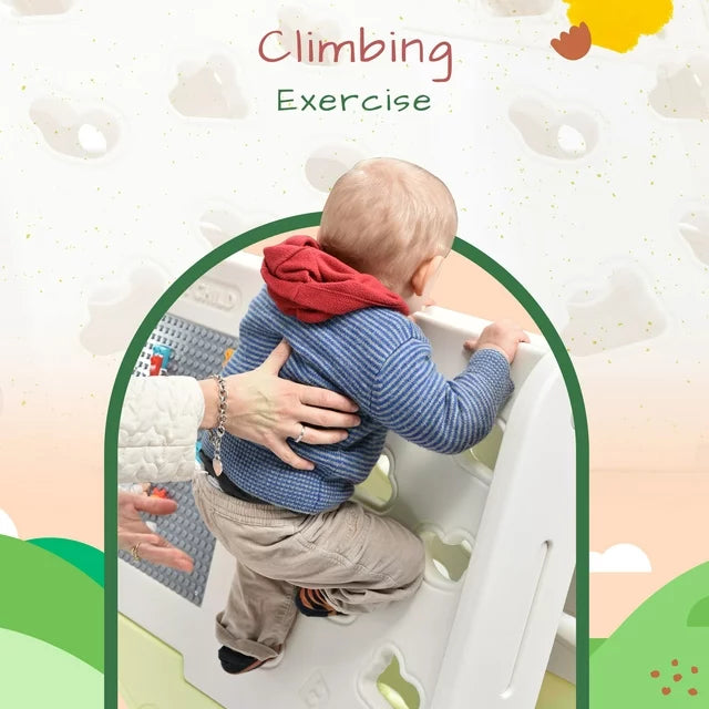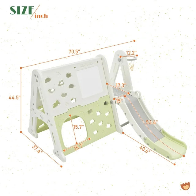 7 in 1 Toddler Climber and Slide Set Indoor Outdoor Backyard Kids Playground Climber Slide Playset with Tunnel, Climber, Whiteboard, Building Block Baseplates and Basketball Hoop for Babies, Green