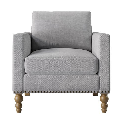 Accent Chair Classic Linen Armchair with Bronze Nailhead Trim Wooden Legs and Button-Dotting Backrest Single Sofa Couch for Living Room, Bedroom, Balcony, Gray