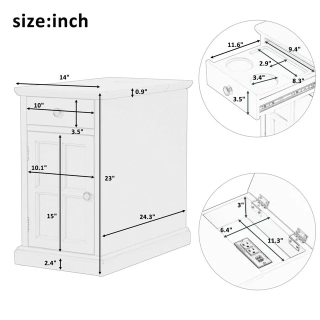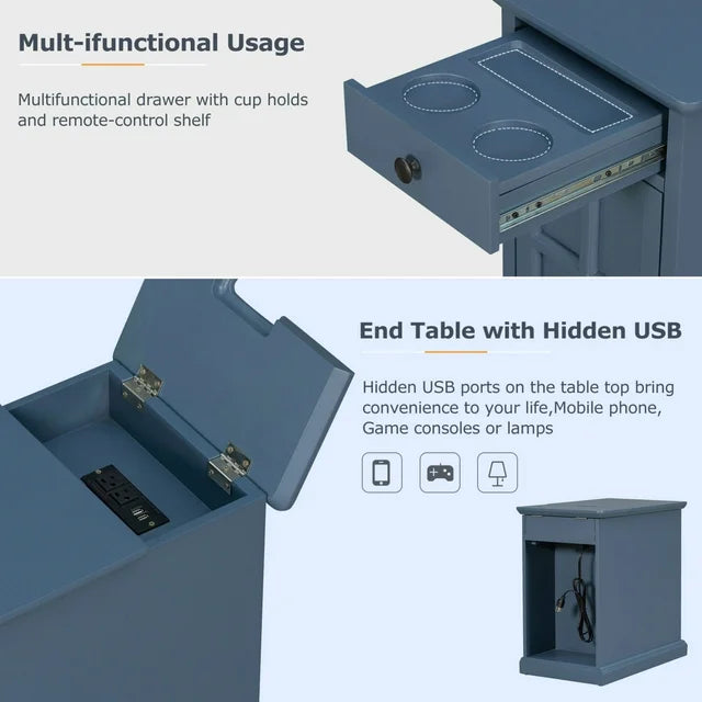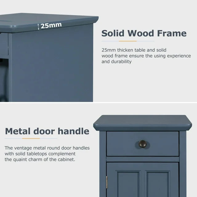 Classic Vintage End Table with USB Ports,Side Table with Multifunctional Drawer with Cup Holders,Night Stand for Living Room Bedroom,Antique Navy