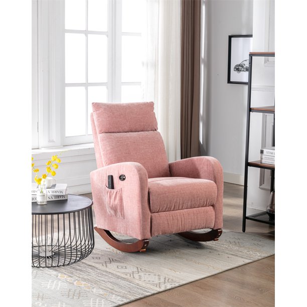 Electric Massage Rocking Chair, Modern Upholstered Nursery Glider Rocker with Vibrating Massage and Extending Footrest, Comfy High Back Armchair Single Sofa Chair with Wooden Base & Side Pocket, Pink