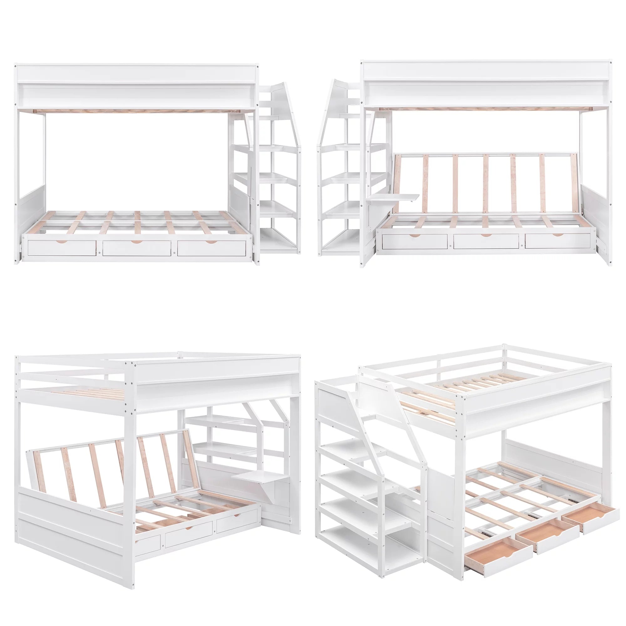 Full Over Full Futon Bunk Bed with 3 Drawers, Solid Wood Convertible Bunk Bed Frame with Storage Staircase and Bedside Table, Down Bed can be Converted into Daybed for Kids Teens Adults - White