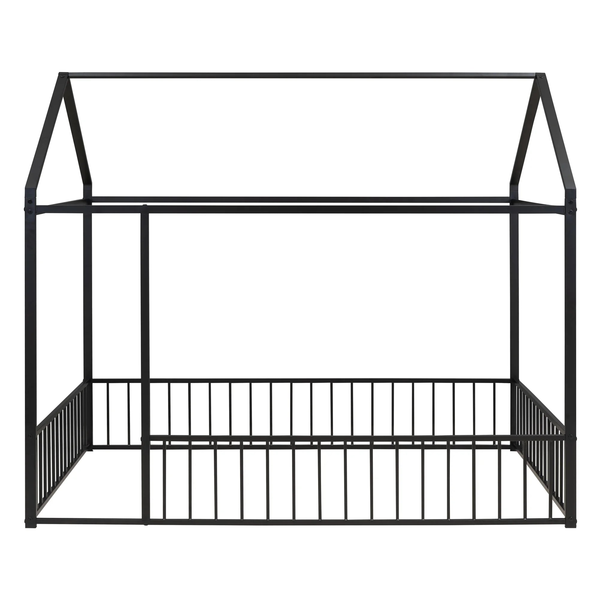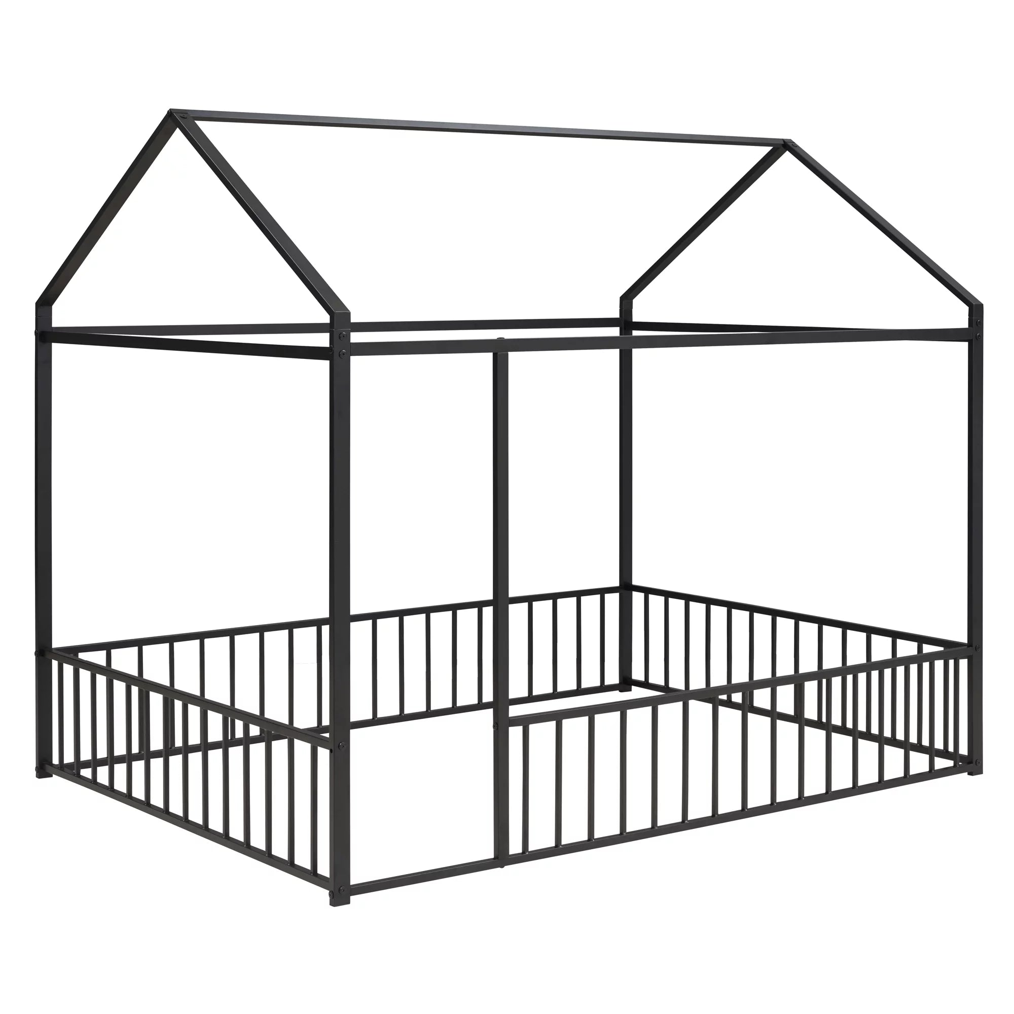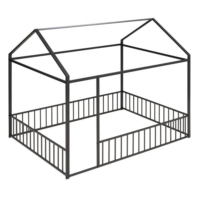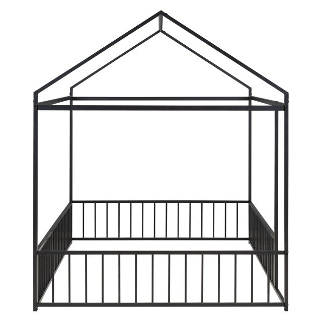 Full Size Floor Bed for Children, Montessori Bed Frame with Roof and Fence, Modern Heavy Duty Metal Bed Frame House Bed for Kids Teens Girls Boys, Easy Assembly, Black