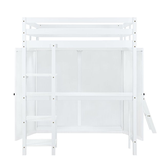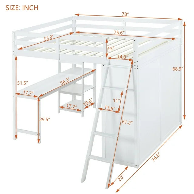Full Size Loft Bed with Desk and Wardrobe, Solid Wood Loft Bed Frame with Inclined Ladder and Full-Length Guardrail, Loft Bed with Desk and Storage for Kids Teens Girls Boys Bedroom Dorm, White