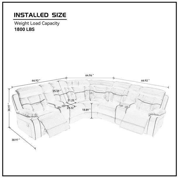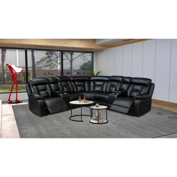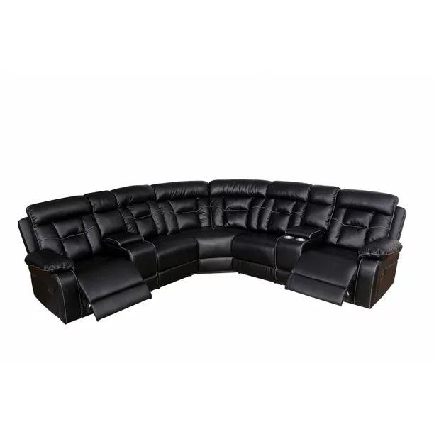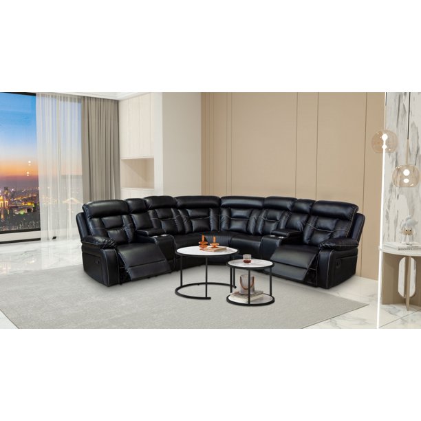 Reclining Sofa, Sectional Sofa with Manual Reclining, Faux Leather Accent Sofa Couch with Center Console and Cup Holders, Large Sectional Sofa for Living Room Apartment Hotel Large Space, Black
