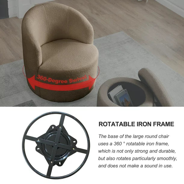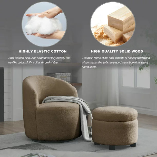 Perfect for any living room, nursery, bedroom, office, or hotel, this upholstered modern armchair features a comfortable backrest and a high-density sponge seat surface for a soft and comfortable sitting experience. The chair's barrel shape allows for 360-degree rotation, while the sturdy solid wood frame, durable foam material, and high-quality rotating iron frame underneath provide sturdy and durable support. The chair's round storage ottoman doubles as a footrest, offering an extra level of relaxation. With its stylish teddy fabric and ergonomic design, this swivel accent chair is the perfect addition to any home or office.