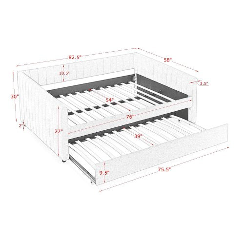 Triple Tree Full Size Daybed with Trundle Upholstered Sofa Bed, with Vertical Stripes, Linen Fabric, Beige (82.5"x58"x30")