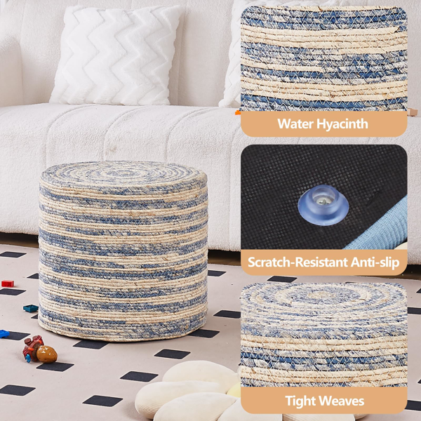 TRIPLE TREE Handcrafted Round Pouf Ottoman with Organic Texture,Natural Seagrass Pouf Footrest with 4 Anti Slip Rubber Pads,Accent Cushioned Seat with Solid Wood Frame,for Balcony,Vanity Room,Blue