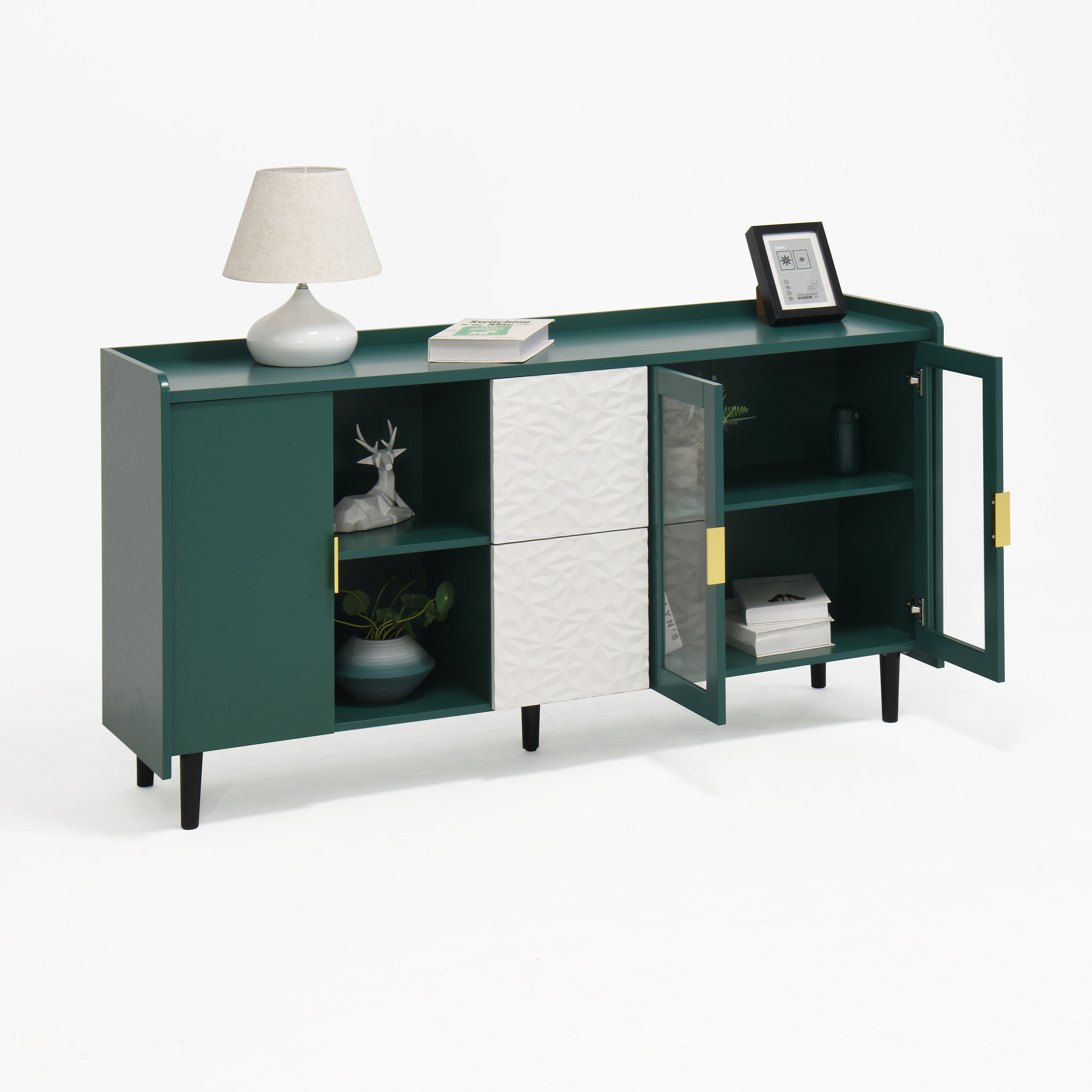 TRIPLE TREE Kitchen Storage Cabinet, 55" Modern Sideboard Buffet Cabinet, Coffee Bar with 2 Drawers and 2 Open Storage Compartment, Wood Buffet Table with 2 Glass Doors for Living Room, Dining Room, Green