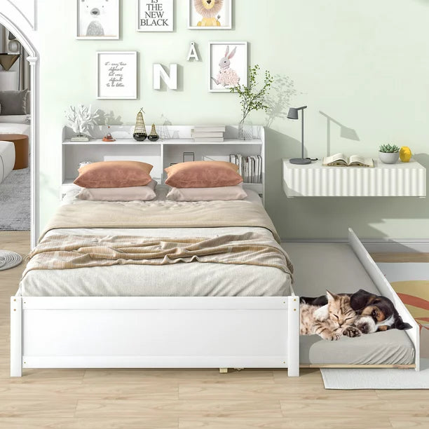 Not sure how to maximize space in a small bedroom This twin bed with trundle and storage headboard is the perfect charming piece for every home. The space-optimizing design will unleash your bedroom’s true space potential and opens up more room for the addition of other furniture and décor. Moreover, the bookcase integrated within the headboard provides ample storage area to keep your room neat and concise. In addition, this twin bed comes in a contemporary and minimalistic-style appearance, making this bed an outstanding centrepiece to any bedroom.