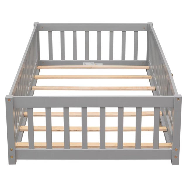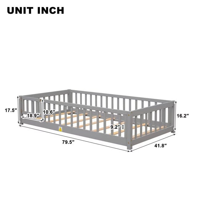 Twin Floor Bed Frame for Kids Toddlers, Wooden Montessori Bed with 7 Wood Slats, Fence-Shaped Guardrails and Door for Boys Girls Bedroom Playroom, No Box Spring Needed, Gray