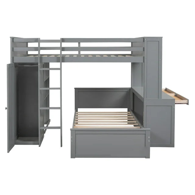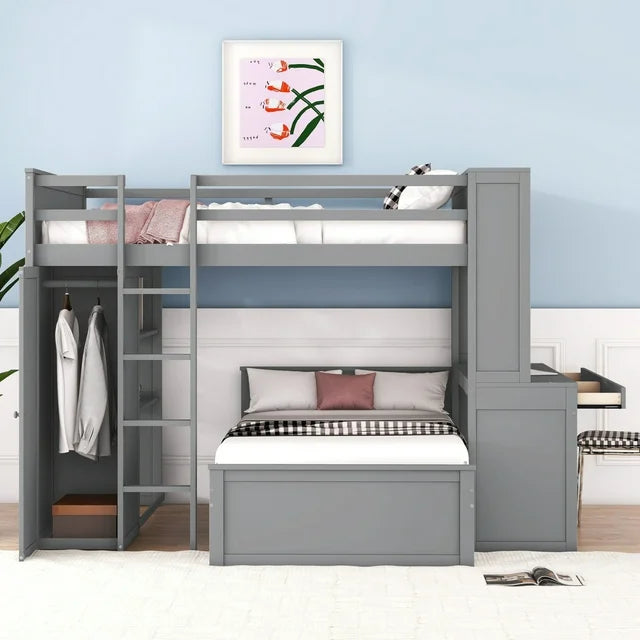 Twin Over Full Bunk Bed with Desk & Wardrobe, Convertible Full Loft Bed & Twin Platform Bed, Wood L Shaped bunk bed with Shelves for Chrildren, Teens, Adult,No Box Spring Needed