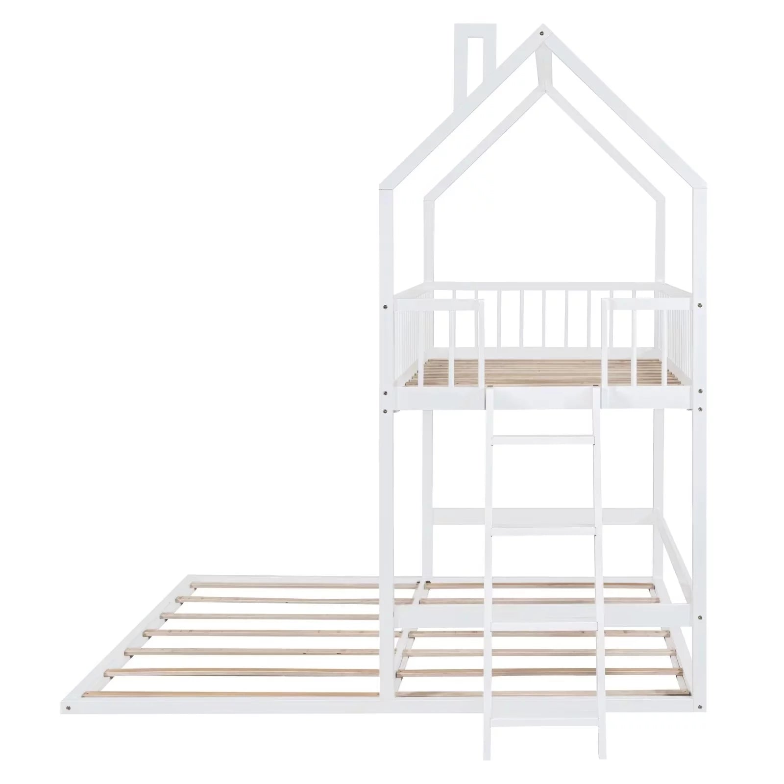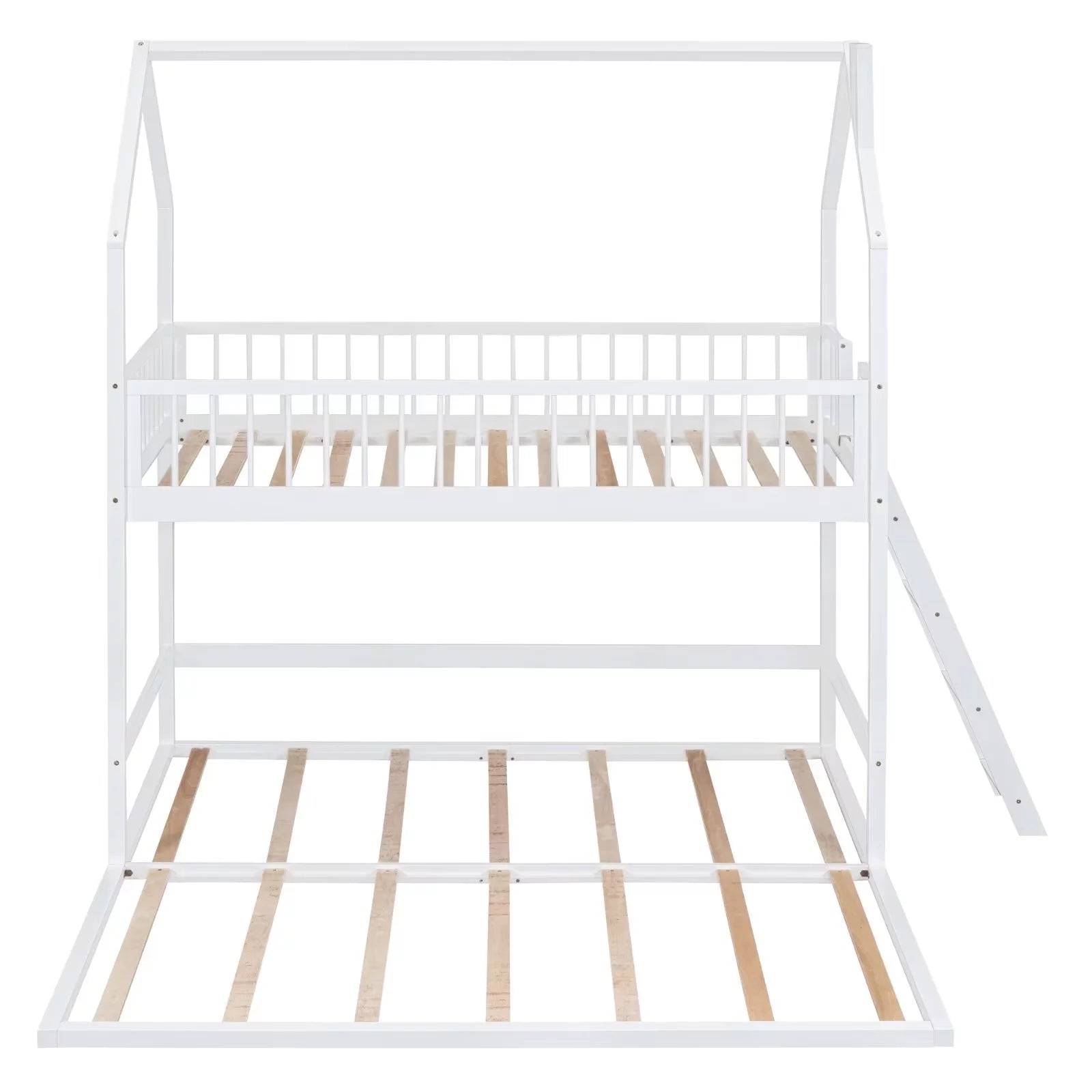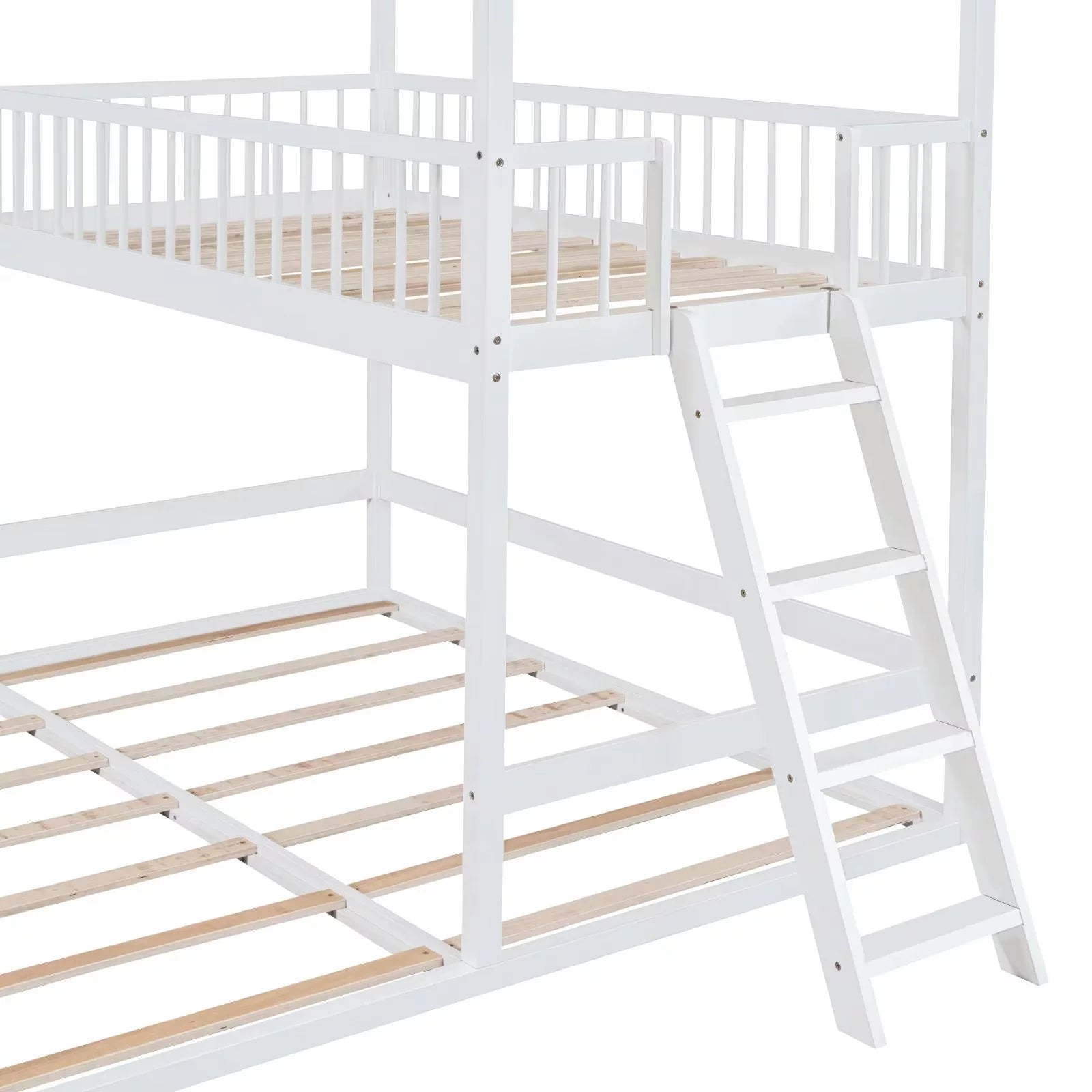 Twin Size Bunk Bed Frame for 3 Children, Extending Wooden Triple Bunk Beds, House Bed with 11.4inch Guardrail and Inclined Ladder for Boys Girls Teens, White