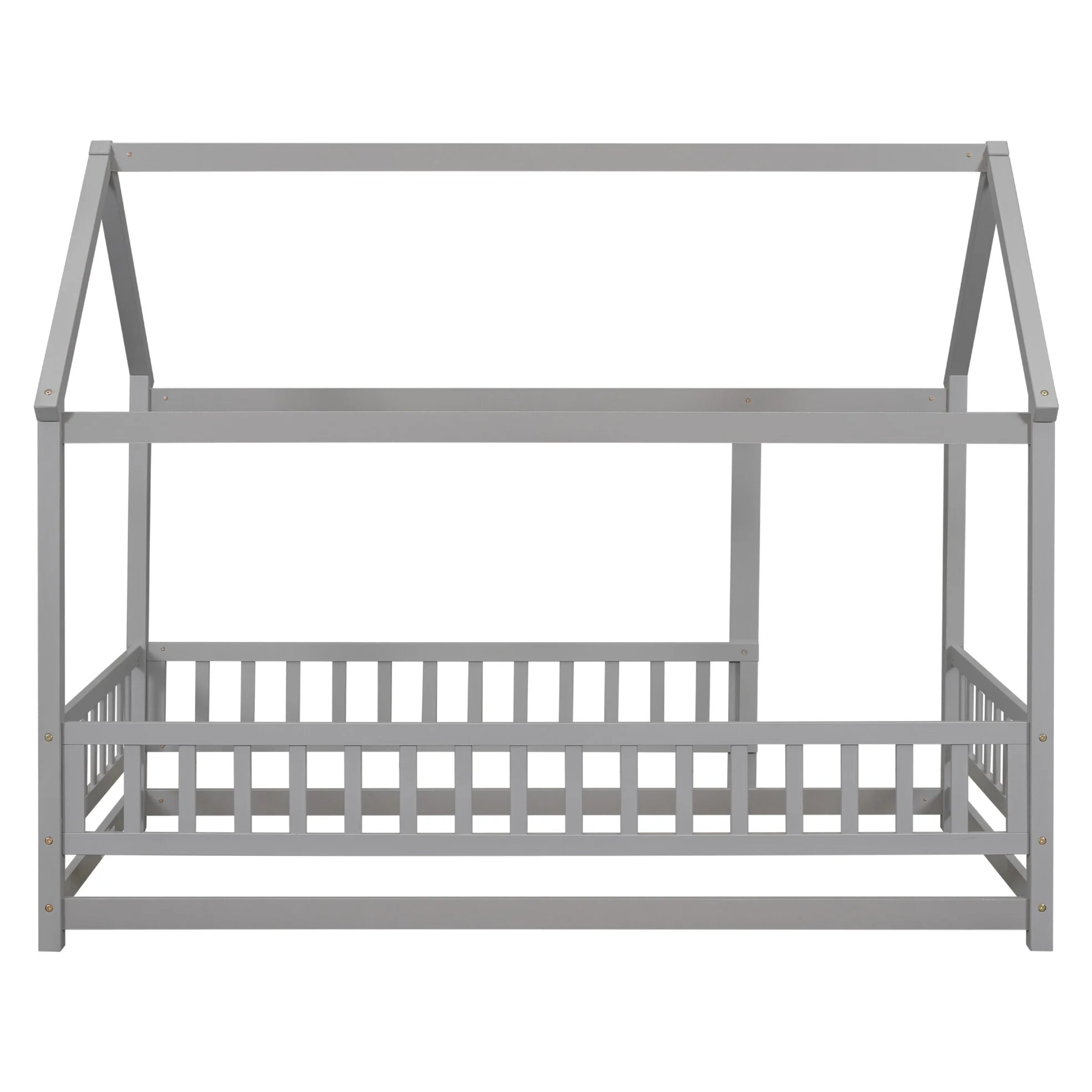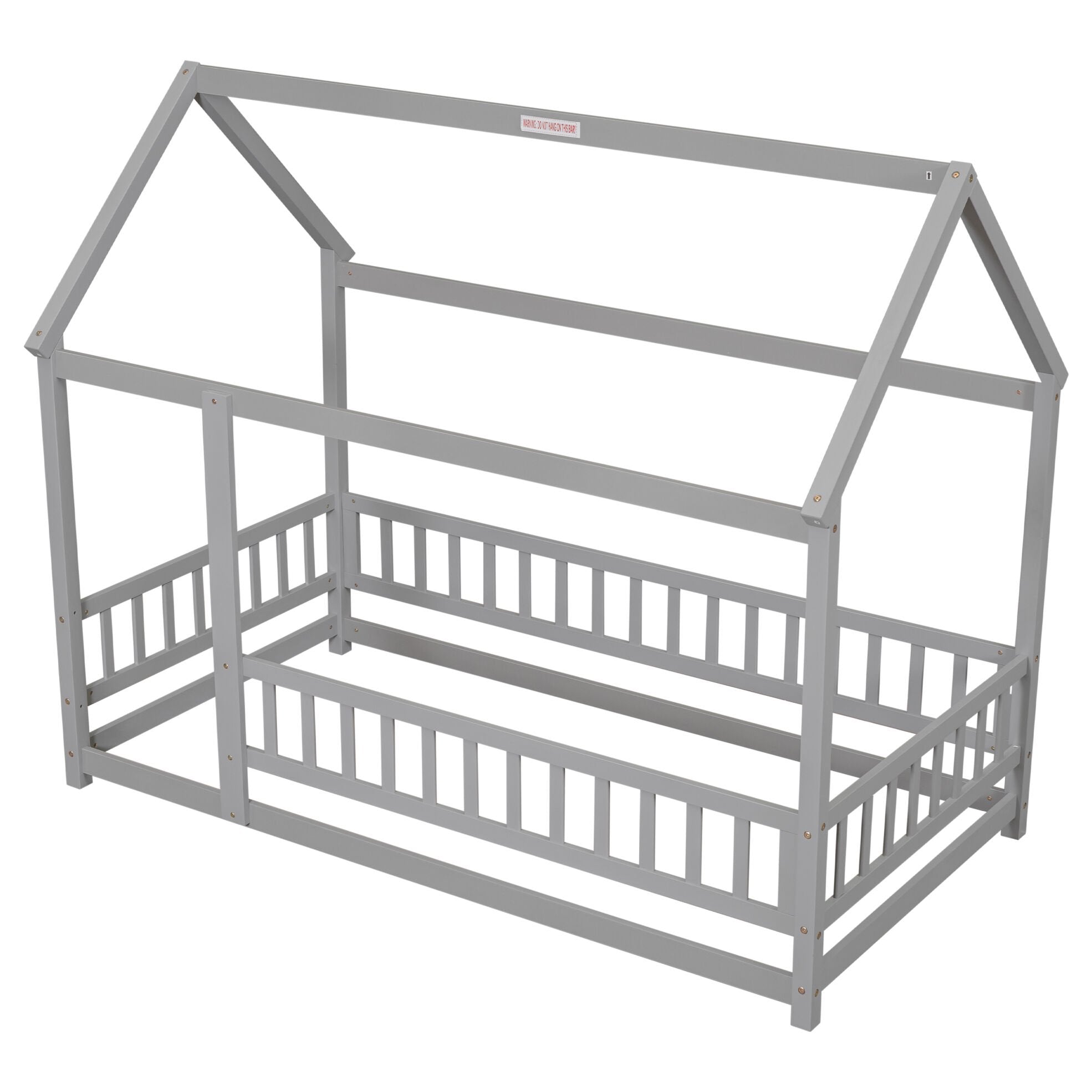 Twin Size Floor Wooden Bed with House Roof Frame, House Shape Platform Bed with Fence Guardrails, Twin Size House Shape Bed for Kids Teens, Gray