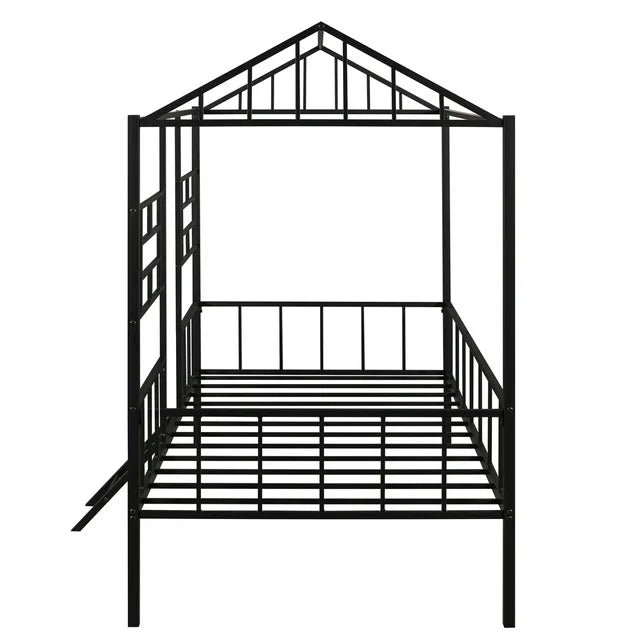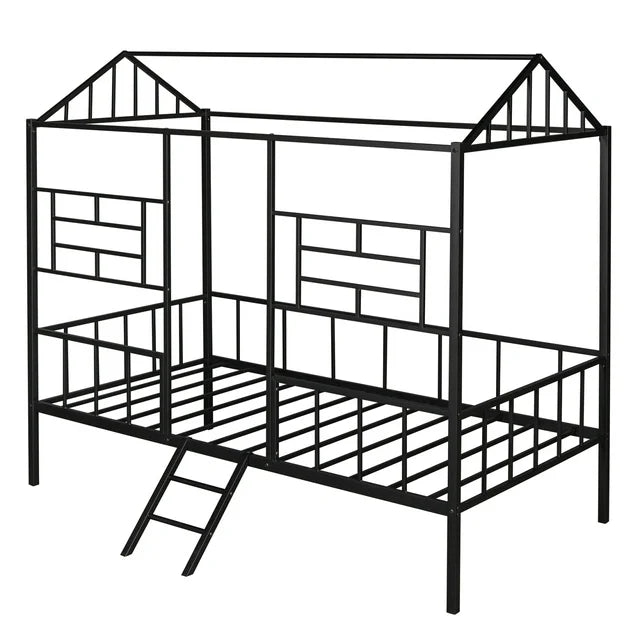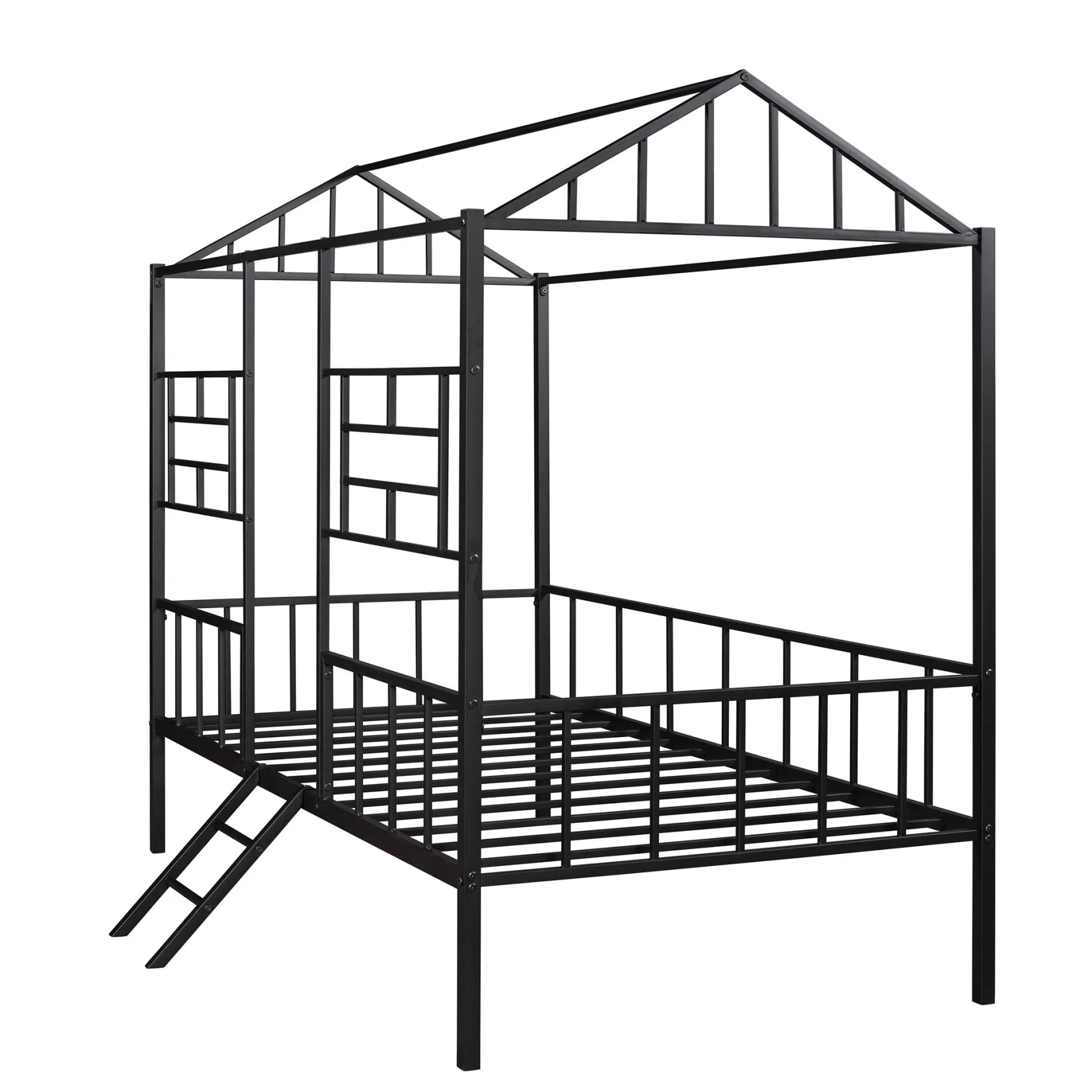 Twin Size House Bed, Metal House Bed Frame with Slatted Support, Low Loft Bed for Kids with Ladder and Full-Length Guardrail, Playhouse Bed with Roof, Window and Door Design for Boys and Girls, Black