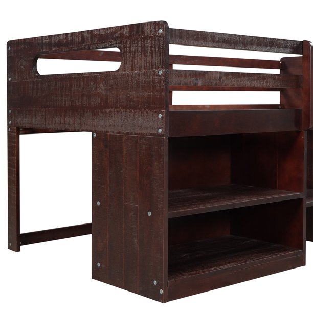 Twin Size Loft Bed, Low Loft Bed with Two Shelves and Two Drawers for Kids Teens Boys Girls, Multifunctional Wood Loft Bed Frame with Storage, Space Saving, No Box Spring Needed, Antique Espresso