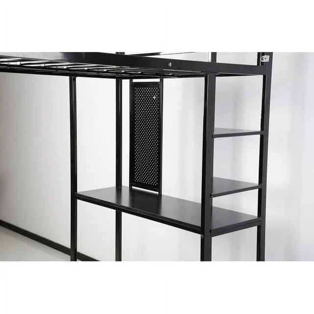 This loft bed features long desk under bed and 2-tier shelves on each corner which creates a personal workstation, making full use of space. The desk and shelves are made of thickened metal board which provides better weight capacity. Get a bed frame from us, let you fall asleep quickly and have sweet dreams. Made of strong metal frame that includes full-length guardrails,an integrated ladder, and 12 secured metal slats to ensure that you will sleep in complete security and stability. It is a value conscious choice as it does not require a box spring or foundation and 12 sturdy bed slats. Just place your mattress on top and enjoy! There are two wooden triangular shelves and a large desk under the bed for you to learn and place school supplies. 58.3” under-bed clearance that you can turn the space into a clever workstation, a reading nook or a craft area. Showcasing guardrails along the length of the bed for extra safety, this must-have bed is a perfect addition to your furniture arrangement. If you have any questions or problems, please feel free to contact us, we will response ASAP. Don't miss the chance to take it home.- Renewed
