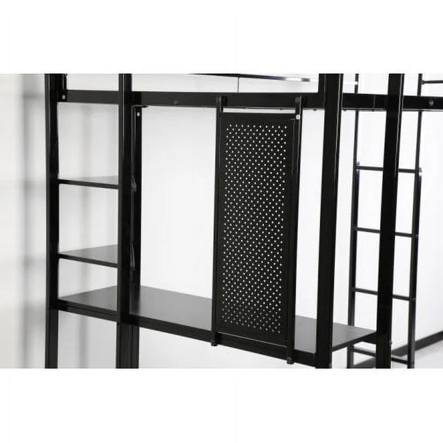 Twin Size Loft Bed with 2 Built-in Ladders, Metal Loft Bed Frame, Multifunctional Loft Bed with Desk and Shelves, Space-Saving Bed Frame with Strong Board Slats, Hold up to 200lbs, Black