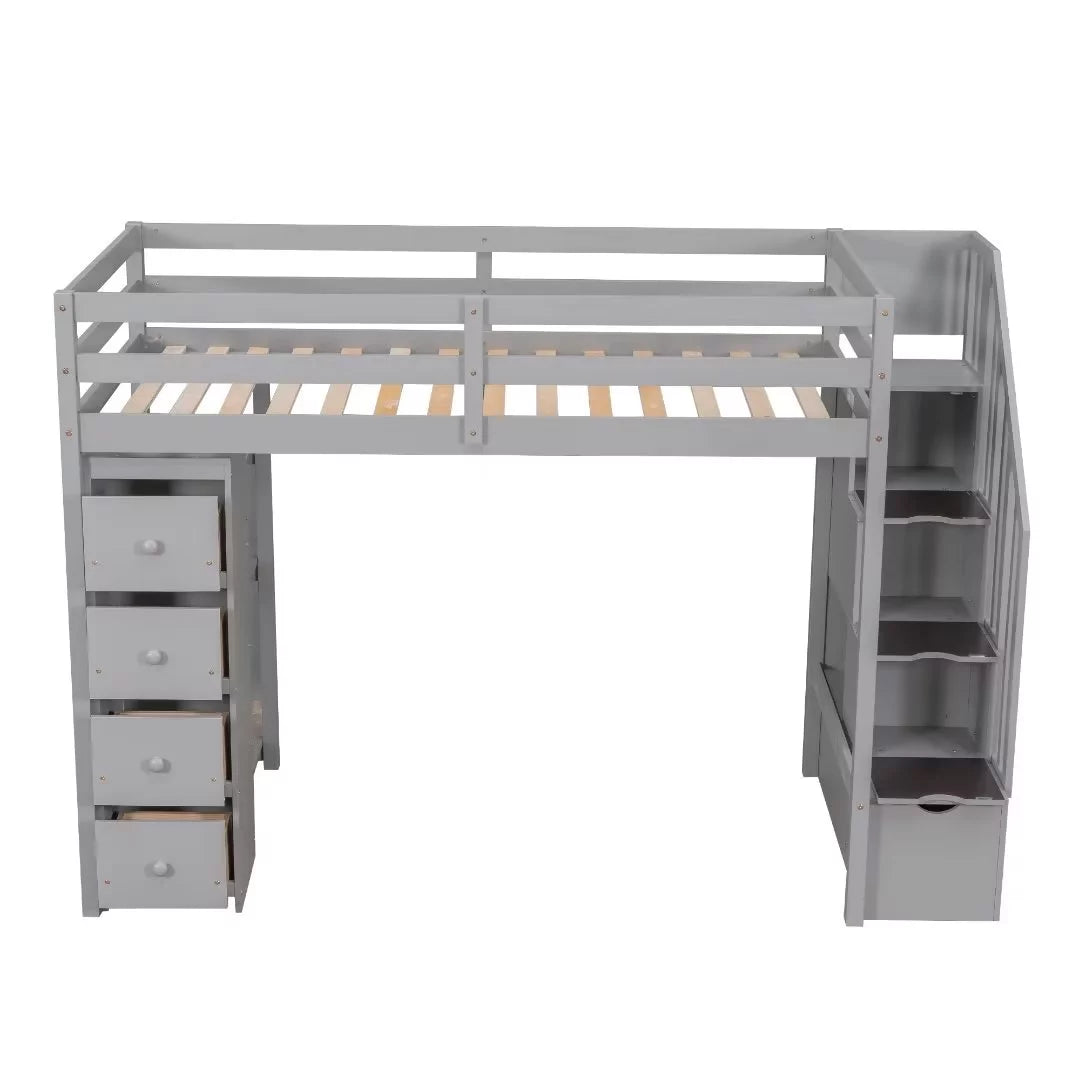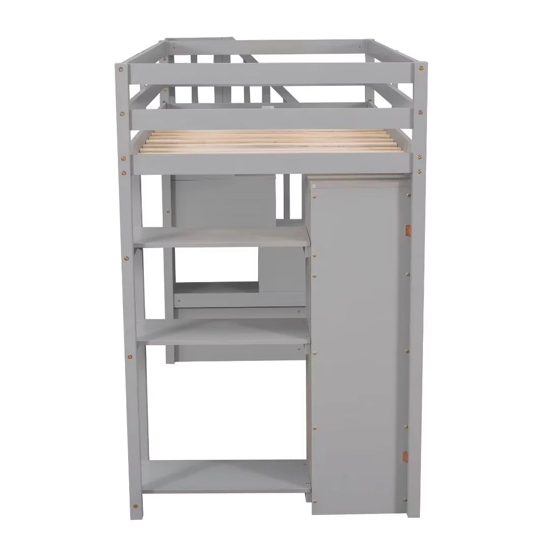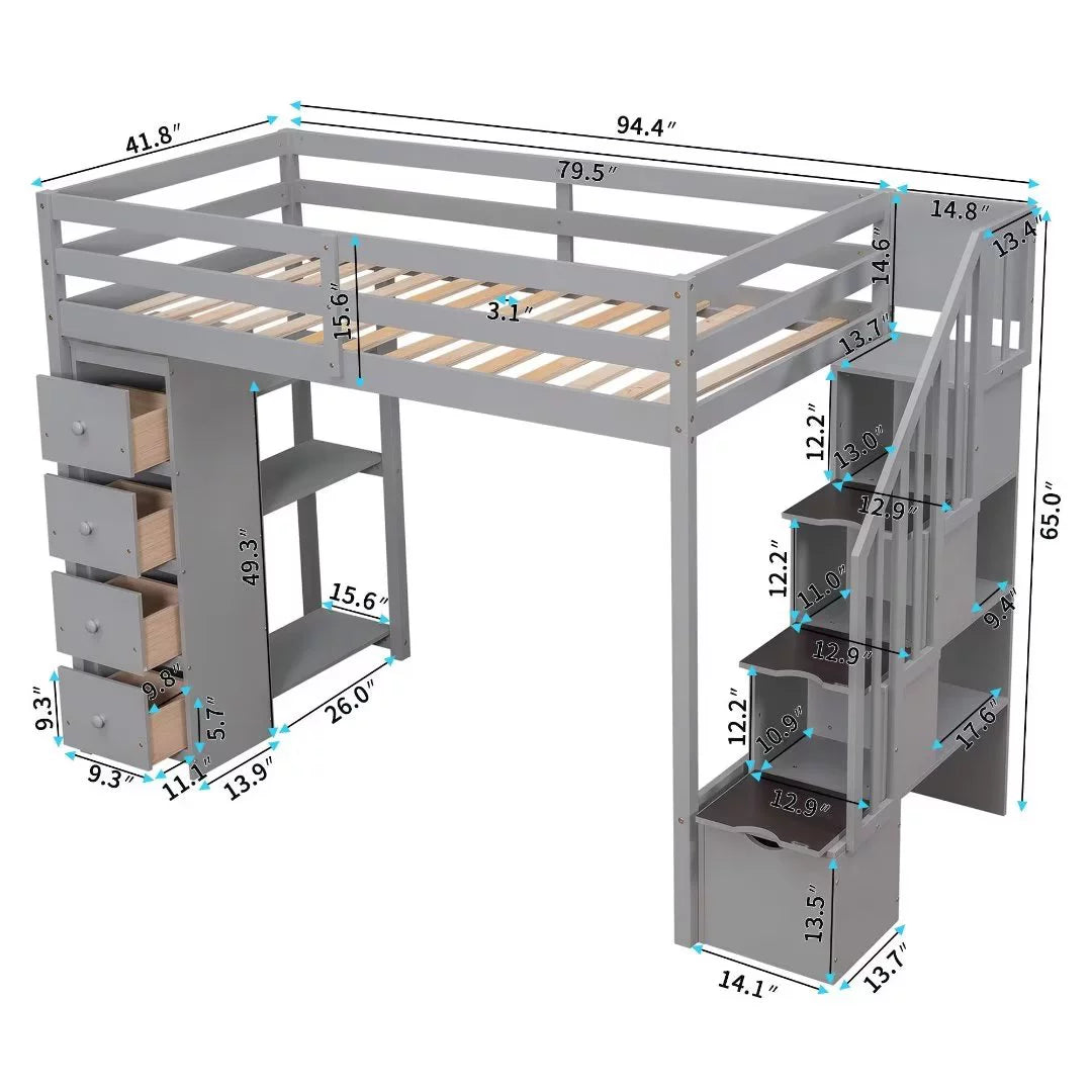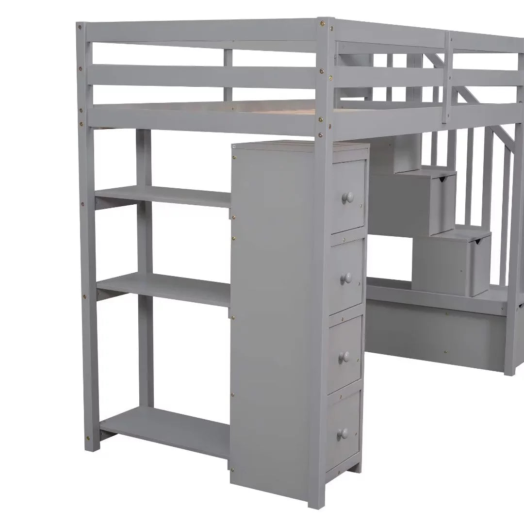 Twin Size Loft Bed with Storage Staircase, Wooden Twin Loft Bed Frame with Drawers and Shelves, Modern High Loft Bed, Multifunctional Twin Loft Bed, No Box Spring Needed, Gray