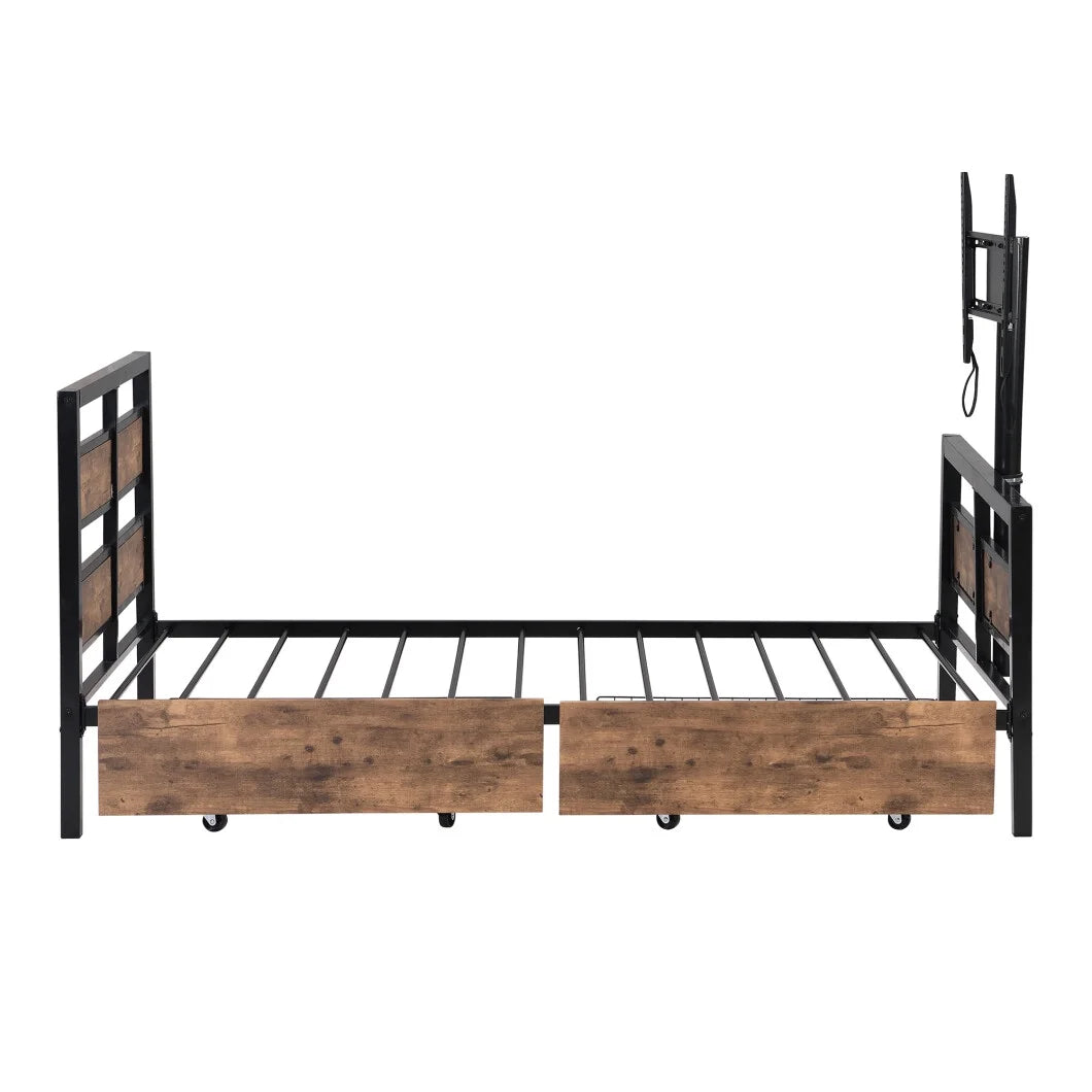 Twin Size Metal Platform Bed with MDF Headboard and Footboard, Multifunctional Platform Bed Frame with Two Storage Drawers and Rotatable TV Stand, Heavy Duty Platform Bed, Easy Assemble, Black