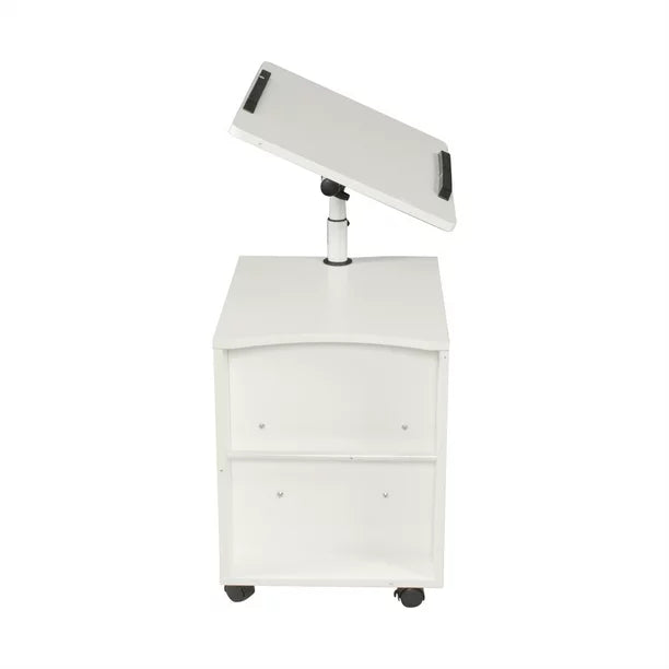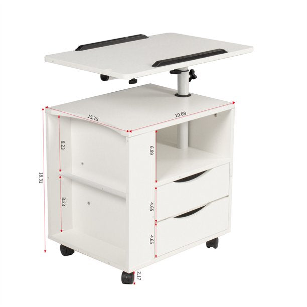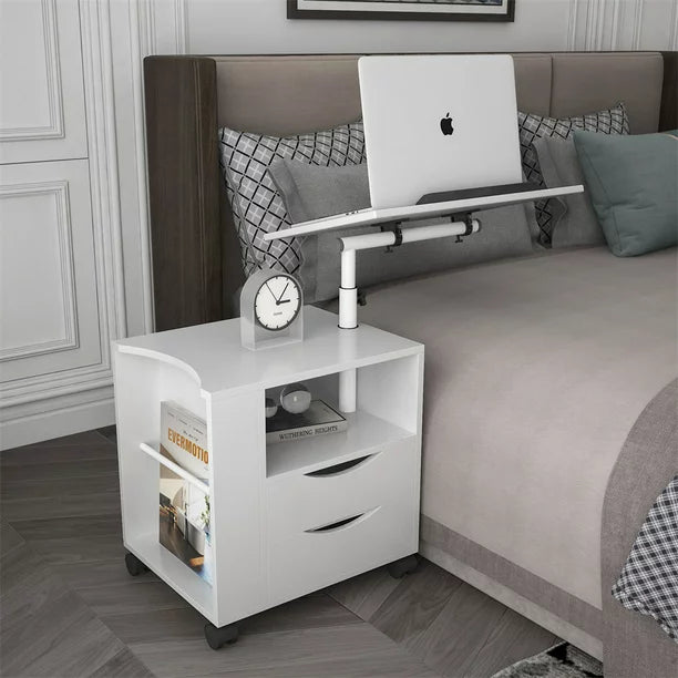 Combine common nightstand's and side table's functions in one. Ideal for working with your laptop or tablets beside beds or sofas.Also use this table as a nightstand, a laptop computer table, study desk, reading, writing, drawing or anything else that you could possibly think of. It’s easy to move the table from one place to another. Height of top panel is adjustable from 27.5 inch to 35.4 inch,perfect for both adults and kids to use under different environment. Top panel swivels 360 degrees laterally and vertically,offering a more comfortable working experience. The bedside table can be moved to anywhere with the universal wheel. Lockable wheels, easy to keep it steady. There is a Q-type clip on the back of the panel to keep your cables neat. 2 drawers and open shelf provide large storage space. Can storage more daily items,make your desktop and room tidy and clean. Safety edge-stopper to prevent objects from sliding off when the panel is tilted.