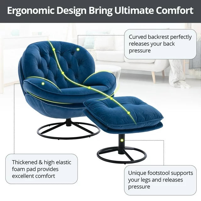 Velvet Swivel Accent Chair with Ottoman Set, Modern Lounge Chair with 360 Degree Swiveling Metal Base & Footrest, Comfy Single Sofa Chair for Living Room Bedroom, Reading Room, Home Office, Blue
