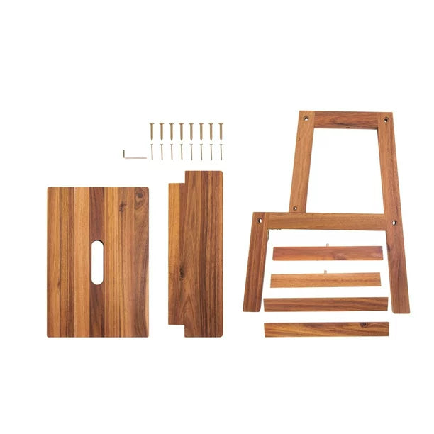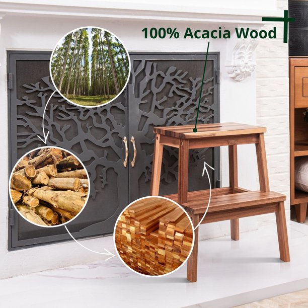 - The 100% Acacia-Wood Wooden Stool is a natural brown color with an attractive grain, adding a warm, rich touch to any home. Its surface is finished with a water-based and light glossy coating, making it suitable for both indoor and outdoor use. This multipurpose stool fits perfectly in every corner of your home, whether you need a place to store towels and candles in the bathroom, a bedside lamp stand, a sub-stool in the living room, or a support for kids while they brush their teeth or wash their hands.