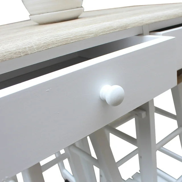 This is a foldable dining cart with two round bar stools. This dining cart is made of sturdy solid wood and PVC surface, which is environmentally friendly and safe. The tabletop can be expanded to extend the use space and can also be folded to reduce the occupied area, which is simple and convenient. There is a hand-pushing handle on the side of dining cart, which is convenient for pushing and pulling to various positions of house. The dining cart also has two drawers, which can accommodate some cutlery, chopsticks, spoons, etc. It is with two stable stools. When you need to use them, you can take them out directly from bottom of the dining cart and use as bar stools or dining stools. You can put them in directly to save space when they are not in use. If you want to have a simple and practical dining cart, this will be your best choice!